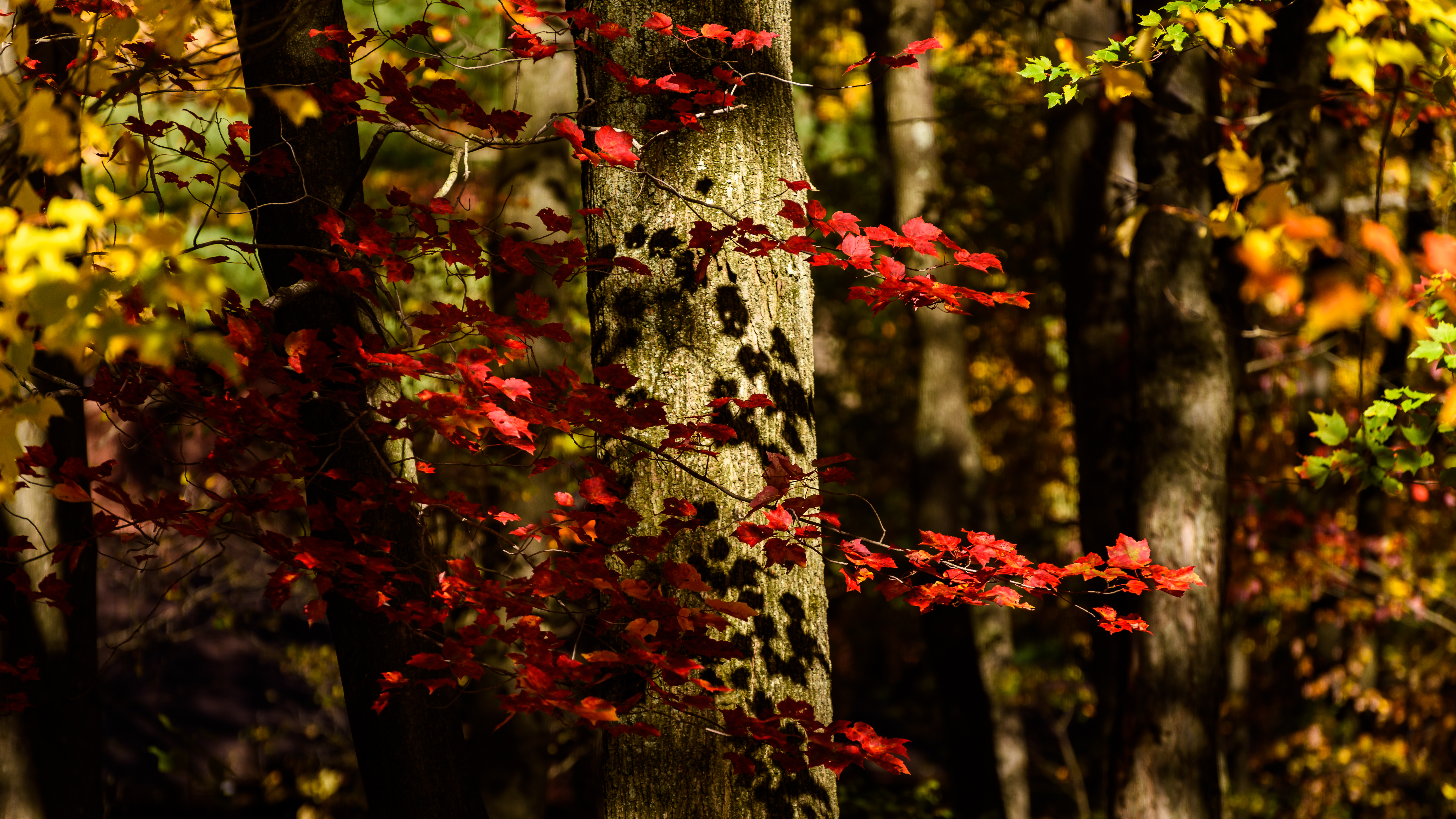 Wow! The last few weeks here in the Northeast have brought color to a whole new level.  The leaves are all changing, and whatever it is that determines how bright and how varied the colors get, well it happened, and the trees are “on fire”.  Shooting in the fall is a no brainer.  Everywhere you look there are gorgeous pictures waiting to be taken.  It’s like a last gasp of nature before winter replaces all that color with the whites and greys we are so accustomed to here in the north.  There’s plenty of beauty in that as well, you just have to look a bit harder.  For this picture I had just finished some yard work, and the golden hour was in full swing.  So I put the lawn mower away, and went for a walk.   It couldn’t have been more perfect. I really liked how the low angle of the sun was causing the leaves to cast their own shadows on the tree behind them.  It’s funny how I had been planning to take a big hike to get some fall shots;  you know, pack a lunch, put on the Merrells, grab the backpack and such.  Then one of my favorite shots of the season was taken literally along the road in front of my own house. Who knew!!!