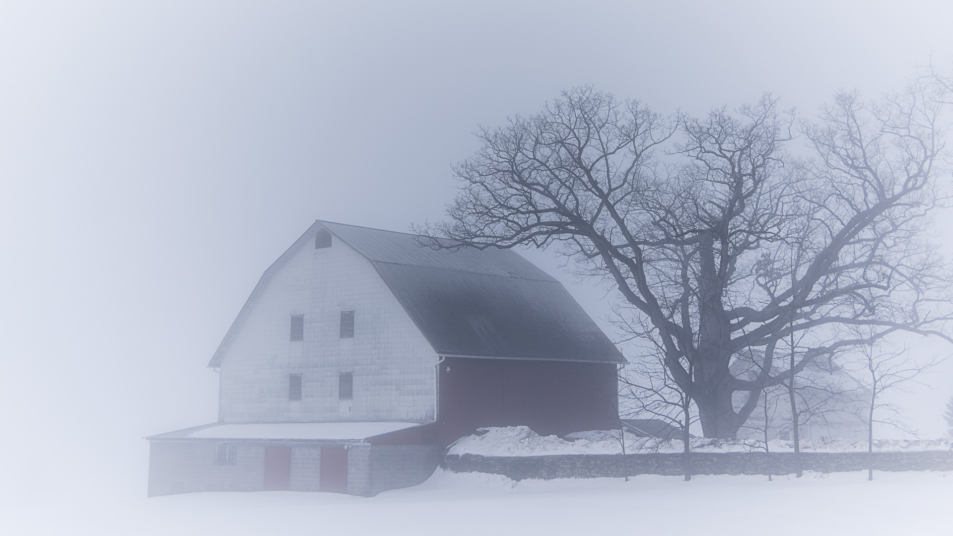 Upon raising the white flag to CSS, I decided to use this image for a post instead.  I would love to say that this is a scene from this year, but it is not.  It’s currently raining, and very green outside my window.  This is a shot from last winter.  It was late in the season, and a fairly warm morning, with a heavy fog on the winter’s blanket of snow.  Believe it or not, there is a nice little pond just beyond the barn, and some rolling hills, but none of that was visible on this particular morning.  I will shoot anything in fog.  It renders your subject in a most sublime setting, and I love the minimalistic profiles it creates of your subjects.  I especially love bare trees in the fog.  As I’ve said before, bare trees are probably my most favorite subject to shoot.  Put them in a foggy setting, and you’ve got a double whami.  It’s always fun to play around with your camera settings to get all different interpretations of the light.  Exposure value and white balance changes, even subtle ones, give your pictures a wide variation of looks that are ready either for the gallery wall, or the trash bin.  Remember though, don’t delete in the field!!  Take them home, and look at them on the computer screen, and learn what different settings did to the overall look of the image.   Long story made short, its fun to experiment, and since this is the digital age, there’s no worry about how much film you’re wasting.  Technology!!