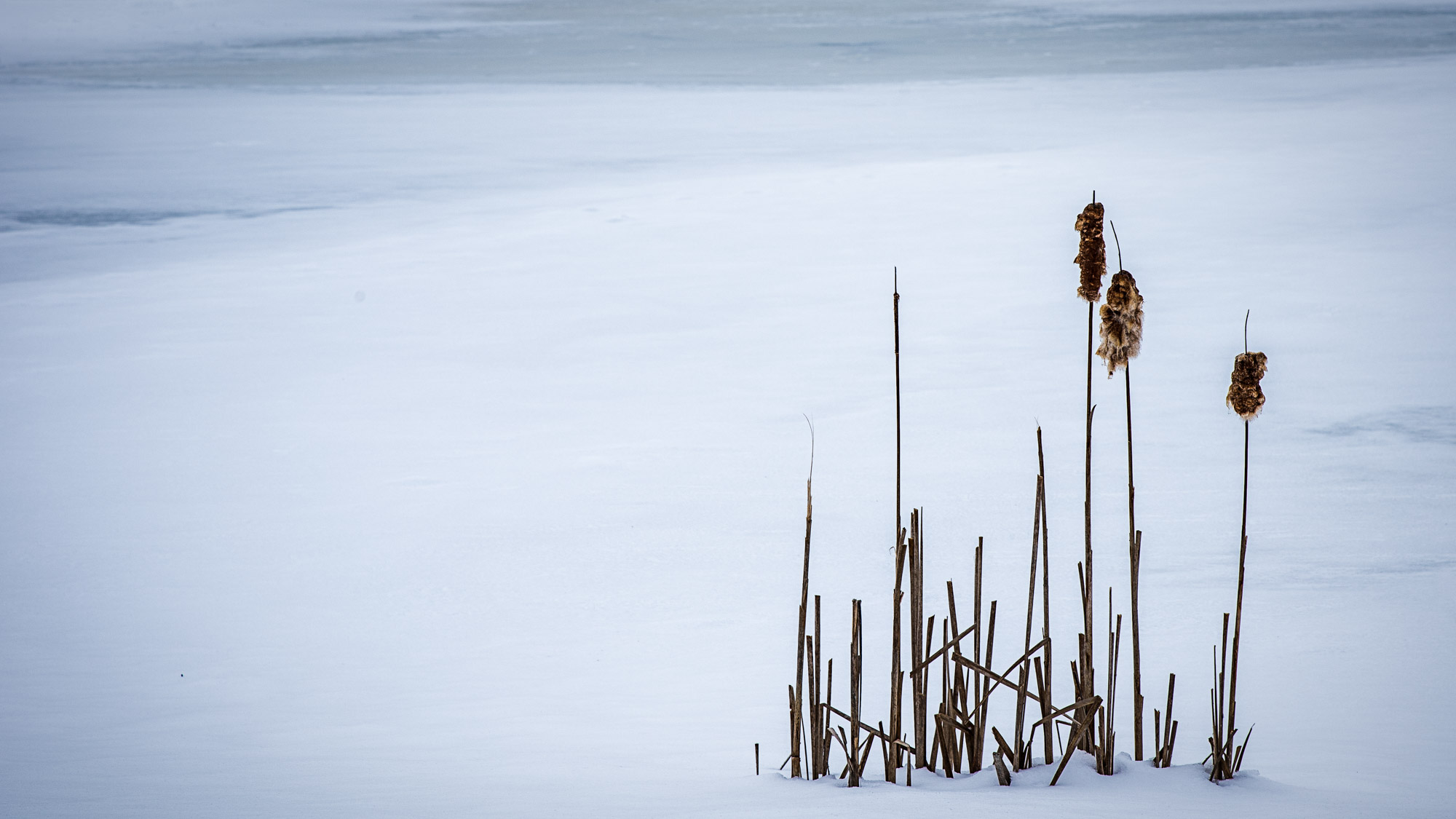 The pond near my home, which has been a constant source of inspiration to me for over 20 years now, never ceases to amaze me.  Every season, and every weather condition, presents to me a photographic composition just begging to be immortalized on film.  Or, on an SD memory card anyway.   The ice on the pond can be pretty thick in winter, and I’ve seen a few hearty souls out there ice fishing in weather I would never consider venturing out in.  I guess this says something for the lure of fishing for some, and the lure of photography for me.  Never question the commitment of a fisherman.  These few cat tails, which withstood the harsh winter of last year, still held some semblance of their former summertime selves in early spring.  The shoreline of the pond is rife with them during the summer.  So much so they dictate where the fair weather fishermen, such as myself, can stand.  In the winter time however, they have all to do to remain upright.  I can assure you though, just a few short months after this picture was taken, they were back again, laughing at the fishermen who cursed them.